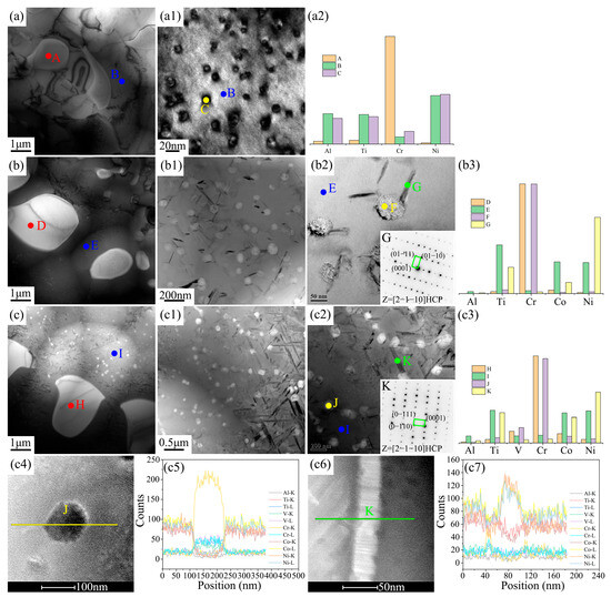 TEM results of the grain boundary microstructure and element distribution of the three new EHEAs: (a–a2) Cr1.3Ni2TiAl; (b–b3) CoCr1.5NiTi1.5Al0.2; and (c–c7) V0.3CoCr1.2NiTi1.1Al0.2.
