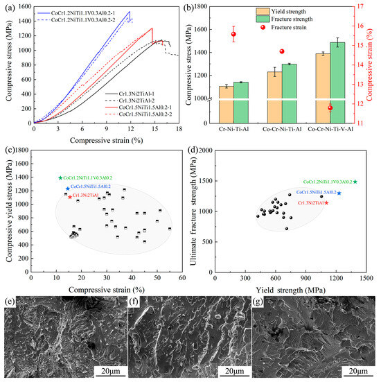 Compression test results of the three new EHEAs: (a) Engineering stress–strain curves; (b) distribution chart of fracture strength, yield strength, and fracture strain; (c) compressive yield stress–strain distribution for FCC+BCC-type EHEAs; (d) fracture strength–yield strength distribution for FCC+BCC-type EHEAs; and (e–g) the microstructures of the compression fracture surface of the EHEAs #1, #2 and #3, respectively.