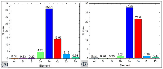 Complementary elemental analysis using X-ray fluorescence (XRF) confirmed and expanded the compositional information of the samples. In the MC sample (Figure 1A), a copper content of 13.93% was recorded, along with an iron concentration approximately three times higher, as well as Ca (4.78%) and Zn (3.13%)—elements commonly associated with carbonates such as calcite, siderite, and hydrozincite. In the MM sample (Figure 1B), the iron content reached 27.76%, likely present as oxides or hydroxides (e.g., hematite, goethite). Trace elements such as Al, Si, Ca, Zn, S, and Pb were also detected at concentrations below 1.28%, associated with gangue minerals and secondary phases.