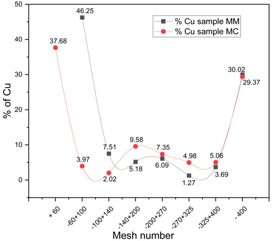 Copper distribution (%) relative to mesh size for MC and MM samples.