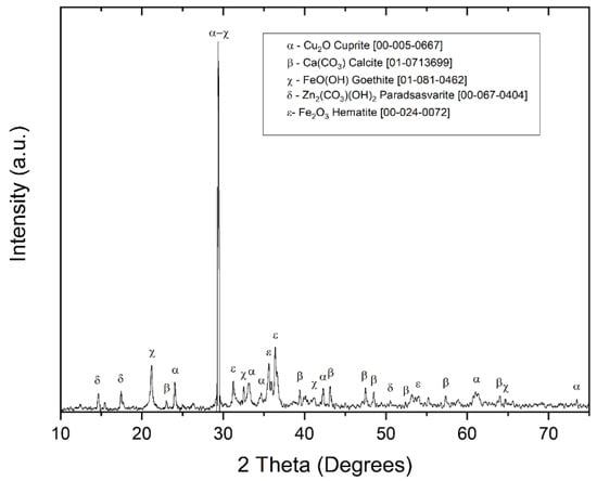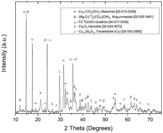 The XRD analysis of the MM sample (Figure 4) identified copper carbonates as the primary mineral matrix, composed mainly of malachite (CuCO3(OH)2) (JCPDS 00-010-0399) and mcguinnessite ((Mg,Cu)2(CO3)(OH)2) (JCPDS 00-035-0481), both of which are considered suitable minerals for copper extraction [51]. Additional detected minerals include tetrahedrite (Cu14Sb13) (JCPDS 00-042-0560), goethite (FeO(OH)) (JCPDS 00-017-0535), hematite (Fe2O3) (JCPDS 00-024-0072), and calcite (CaCO3) (JCPDS S96-901-6707), which correlate with the iron and calcium contents identified in the chemical analysis.