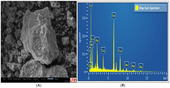 The secondary electron micrographs of the MM compound particles (Figure 6A) exhibited a more homogeneous texture with smooth edges, corresponding to the laminar morphology typical of carbonate minerals. EDS analysis (Figure 6B) revealed the presence of Cu, Fe, O, C, and Ca, along with trace amounts of Al and Si, in agreement with the results obtained by XRD and XRF. These elements are associated with minerals such as malachite (CuCO3(OH)2), mcguinnessite ((Mg,Cu)2(CO3)(OH)2), hematite (Fe2O3), goethite (FeO(OH)), and calcite (CaCO3), confirming the mineral matrix of the compounds used.