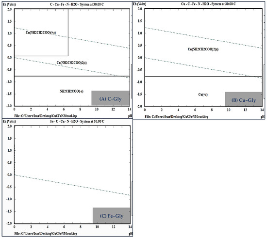 In Figure 7A, the predominance area of the copper diglycinate complex (Cu(Gly)2), which is responsible for copper complexation in solution, is observed between −0.1 and 1.2 volts and within a pH range of 0 to 11.5, falling inside the water stability region. This confirms the need for oxidizing conditions in the experimental tests and the stability of the ligand under alkaline conditions (Figure 7B). No evidence of iron–glycine complex formation was found, indicating no competition in copper complexation despite the high concentrations of iron (Figure 7C).