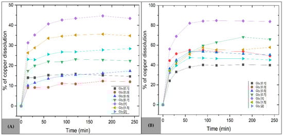 In Figure 8A, which shows the dissolution of copper from the MC sample powders, no significant dissolution rate was observed at concentrations between 0.1 and 0.5 mol·L−1. Copper dissolution becomes favorable at concentrations above 0.7 mol·L−1, reaching a maximum of 44.66% copper in solution after 180 min at 1 mol·L−1. Beyond this concentration range, copper recovery decreases to 28.4% due to glycine saturation in the system. The initial stage involves the formation of metal hydroxides due to hydrolysis and the presence of oxygen during dynamic agitation, which increases copper availability for complexation with glycine and ensures the stable formation of the diglycinate complex (Equations (2) and (3)).