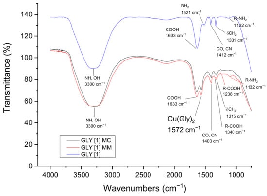 To confirm copper complexation from both mineral compounds, the leachates were analyzed using Fourier-transform infrared spectroscopy (FTIR). A control solution containing 1 mol·L−1 glycine was compared with the final aliquots from each mineral sample at the same ligand concentration. The results indicate the presence of the characteristic functional groups of glycine (NH2, CH2, COOH), confirming the purity of the reagent in the control solution. In the leachates from the MC and MM samples, a band at 1572 cm−1 corresponds to the carboxylate group, indicating the coordination of Cu2+ with glycine (Figure 9). Although the band positions for free glycine and the Cu–Gly complex do not vary significantly, the intensities of the free glycine bands decrease, suggesting its reaction with copper ions [56,57]; these findings support the formation of the copper–glycine complex.