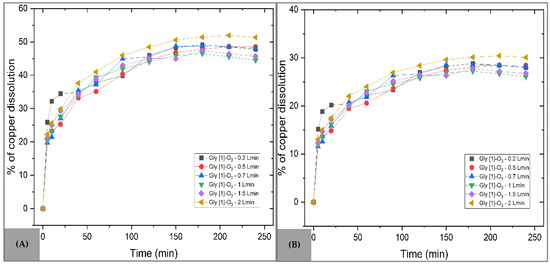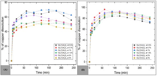 The oxidizing environment facilitates the conversion of Cu+ to Cu2+, allowing the Cu2+ ion to associate with the glycinate ion [55,62], as represented in Equation (9), achieving a maximum copper dissolution of 69.76% at an H2O2 concentration of 1%.