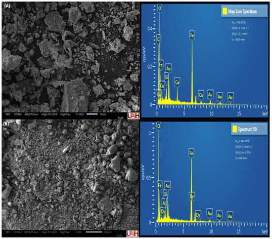 In Figure 12A, a predominant presence of iron is observed, which was not complexed by glycine. The remaining copper corresponds to a maximum leaching efficiency of 51.92%, indicating that 48.08% of the mineral powders remained unreacted. In contrast, in Figure 12B, the addition of H2O2 significantly reduced the copper content in the residual solids, rendering it undetectable in the compositional analysis.
