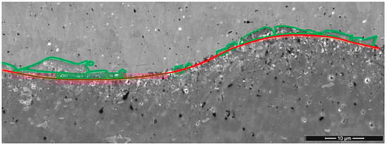 Wavy interface morphology in MPW welding between HC420LA steel and AA6082-T6 (intermetallics delimited in green and wavy interface in red).