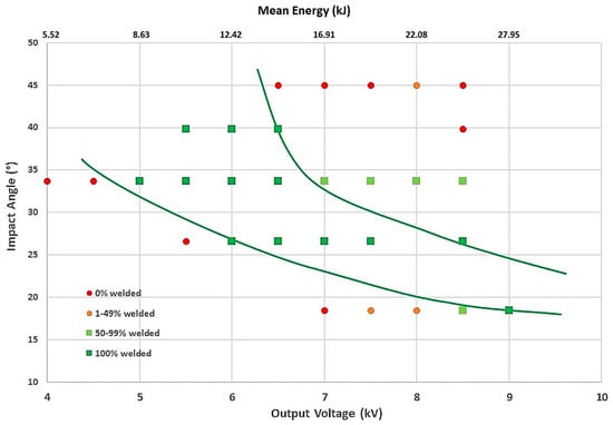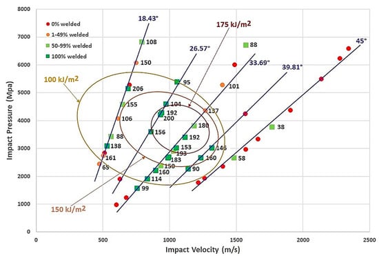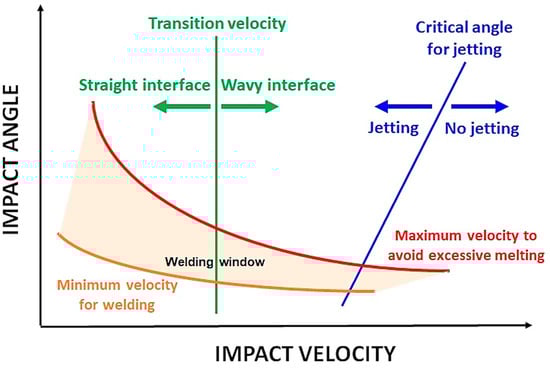 Weldability window of explosive welding (EXW), showing the weld success based on the impact velocity vs. impact angle. Reprinted from Ref. [36].