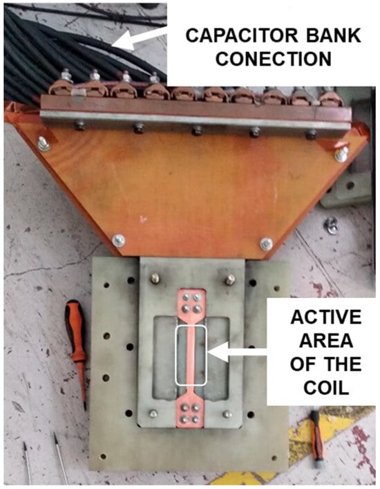 The electromagnetic pulse welding tests were carried out using lapping 50 × 25 × 1 mm3 steel and aluminum specimens. The tests were carried out at the Innovaltech platform in Saint Quentin, France. The equipment used was a 9 Kv/25 kJ (690F) PULSAR MPW system, which provides an impulse current between 250 and 550 kA, a pseudo-frequency in the range of 16 to 18 kHz, and an output voltage between 4 and 9 kV. This system was connected to the coil and to the clapping system in which the steel and aluminum plates that were going to be joined were located. A flat electromagnetic coil was designed for the experiments (Figure 7) due to the nature of the joint to be made. In order to isolate the current discharge through the coil from the metallic elements of the system, the electromagnetic coil was embedded in a block of G10, a laminated material made with fiberglass and epoxy resin whose most outstanding properties for the present application are high mechanical resistance and electrical insulation. This figure also shows the connections required by the coil for its connection to the capacitor bank and the actuator zone. This last area was where the moving plates were positioned and where the magnetic pulse would be generated.