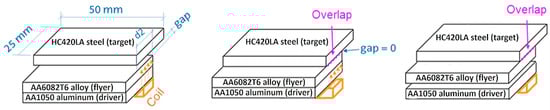where Gap is the stand-off distance between the parts to join (m), Cantilever is the free length of the flyer (m), and Overlap is the distance the flyer overlaps with the coil (m) (Figure 5).