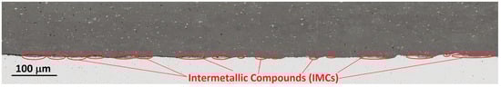 A study by Aizawa et al. [20] found evidence of fusion and solidification at the interface of the two welded surfaces, in contradiction to previous postulates. A very high temperature increase was identified in the interface but, due to its instantaneous nature, it was not enough to spread throughout the part and its effect was located in the intermediate layer between the two welded sheets. The welding was considered to be due to the combination of magnetic pressure and heating by the Joule effect. The solid-state reaction at the junction interface could induce the formation of intermetallic phases, with the observation of localized fused points at the junction interface not being common and not being a prerequisite for the formation of intermetallic compounds.