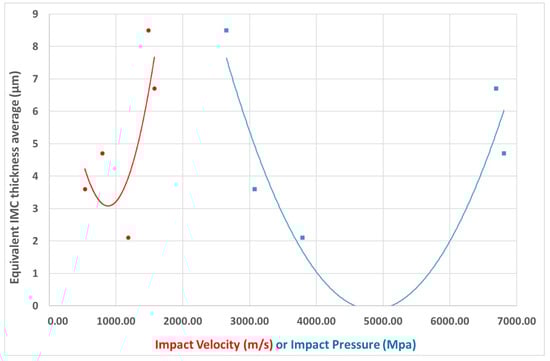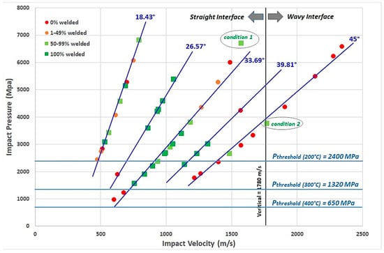 Different studies [18,19] suggested that the temperature generated at the interface due to the impact at high speeds and consequent pressure was well below the melting temperature of the elements to be welded. On the other hand, the formation of intermetallic compounds was considered unlikely, assuming that the welding was induced by the impact pressure and totally ruling out the effect of heating.