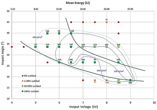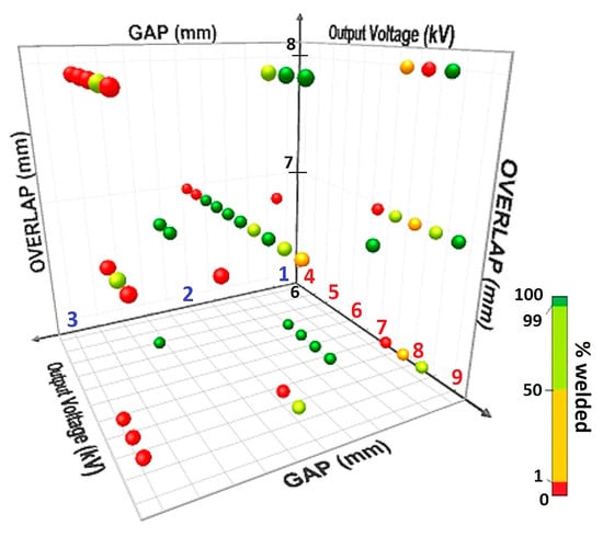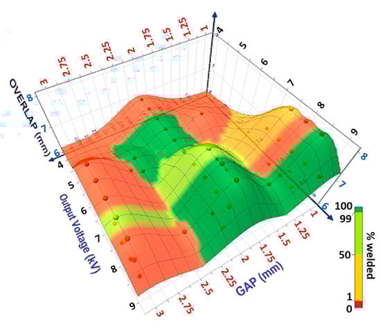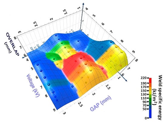 To determine the welding parameters, it is possible to build a weldability window that can be called a process window. If the machine, the tool, the assembly, the welding configuration, and the materials to be welded are to be defined, this consists, for example, in finding, in the plane (discharge energy, gap), the points that make it possible to carry out a consistent weld [30,31]. These weldability windows are generally obtained by means of numerous tests. While the practical value of these weldability windows is obvious, the fact remains that they are difficult to transfer from one configuration to another. In this context, it may be relevant to construct weldability zones that are functions only of the materials to be assembled and not of the welding configurations.