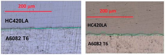 In impact welding, the interface area of the joint shows a wavy morphology, characterized by a pattern similar to “Velcro”, where the two joined plates are mechanically interlocked (Figure 3). This wavy interface occurs with all impact methods. However, the length and amplitude of the waves tend to vary depending on the process by which the weld was performed. Psyk and Raoelison [21,22] associated the wave morphology of the junction with the process parameters of discharge energy and impact velocity.