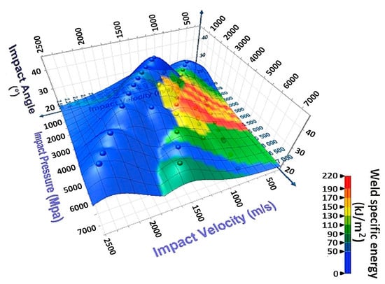 where Vi is the impact velocity (m/s), Gap is the initial stand-off distance between the two parts to join (m), Pi is the impact pressure (N/m2), and ef and ρf are, respectively, the thickness (m) and the density of the flyer (kg/m3).