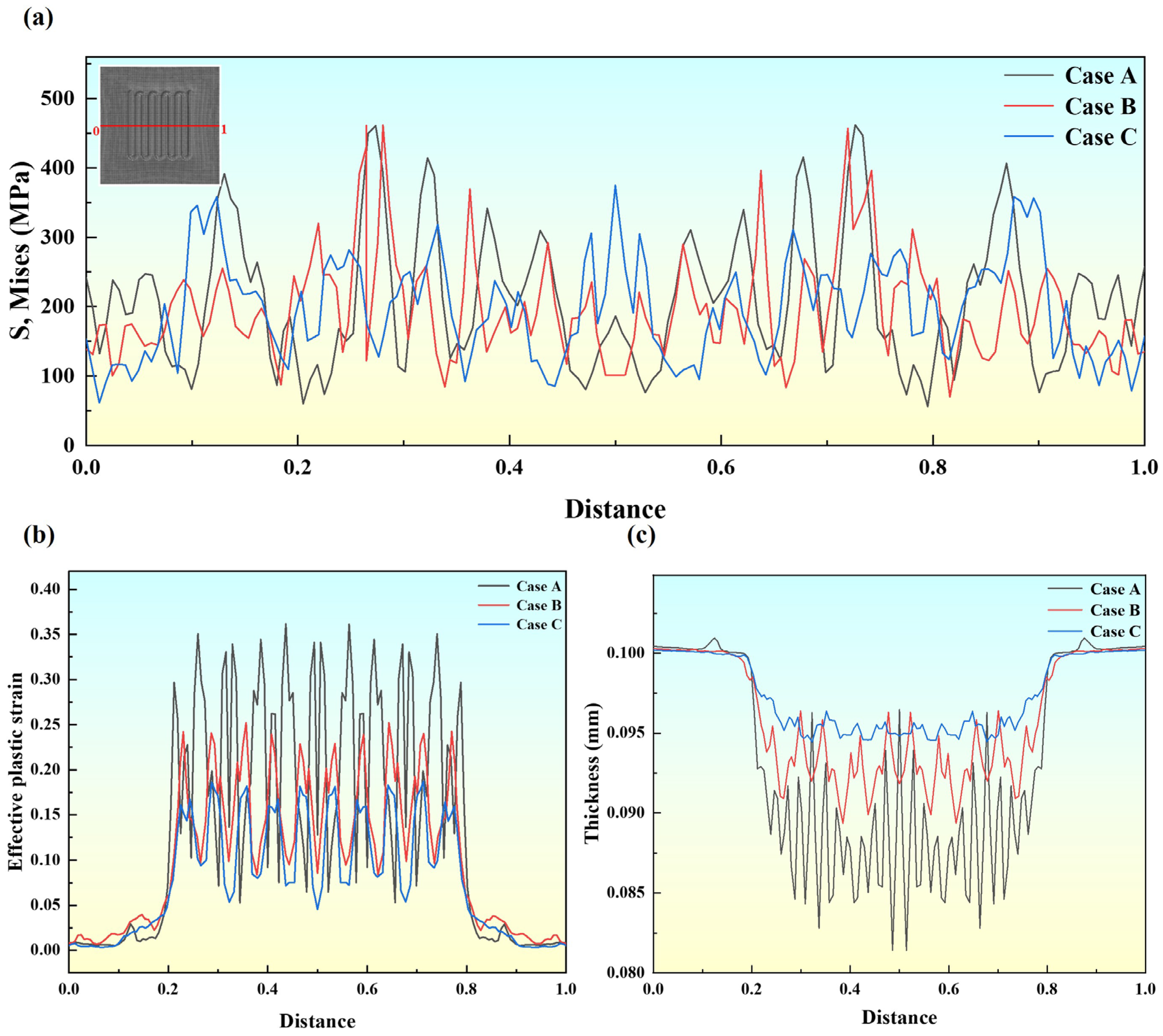 - Process parameters play a critical role in the forming quality of BPs. At a stamping speed of 100 mm/s and a friction coefficient of 0.185, the peak stress and strain are 647.3 MPa and 6.76%, respectively, with a thickness-reduction rate of 26.8%. This enables optimal material flow and die conformity, uniform stress distribution, and effective control of strain and thickness reduction. Proper matching of stamping speed and friction coefficient is key to improving forming quality.