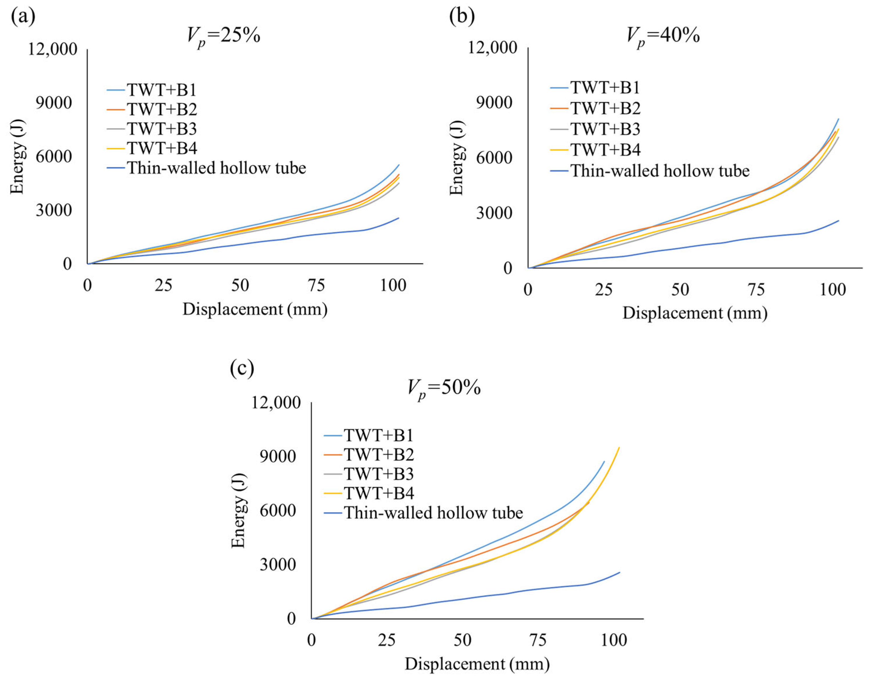 Figure 8a reveals that TWT+BHC suffered a consistent decline in stability and energy absorption capacity as fillers dominated the deformation with the increase in . As gradually increased from 25% to 50%, the stiffer hierarchical honeycomb ( ) sustained global bending deformation. It is further illustrated in Figure 8b that the force displacement response of TWT+BHC at was similar to that of hollow TWT, which implies that the deformation was dominated by the housing tube while the filler densification dissipated additional energy. However, beyond this range, the BHC pattern triggered an unfavourable response, leading to a drastic increase in IPF, followed by a significant decrease in energy absorption in the stress plateau phase.
