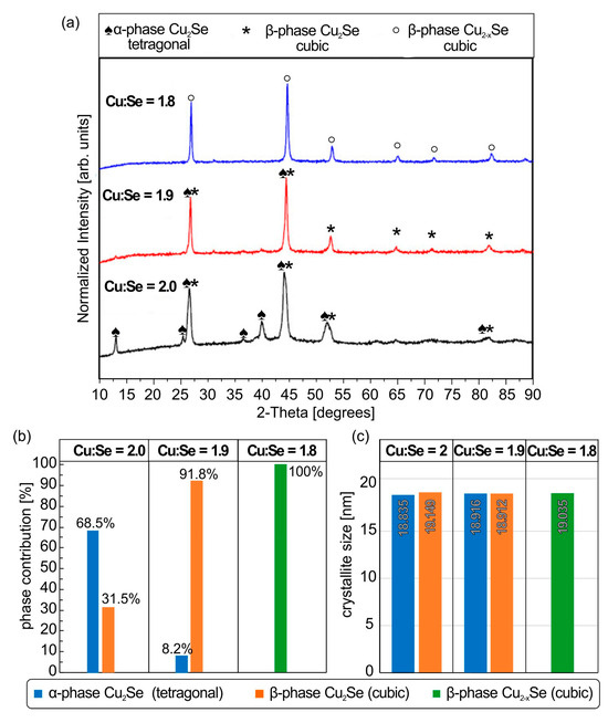 (a) XRD patterns of the produced powders in several Cu/Se stoichiometries. Comparative graph of (b) crystalline phase percentage and (c) crystallite size of the produced powders in several Cu/Se stoichiometries.