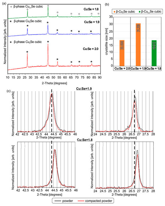 When comparing the compacted samples with the initial powders across all Cu/Se stoichiometric ratios, no peak shifts toward smaller or larger angles are observed, indicating that cold compaction does not induce lattice deformation (either uniform or non-uniform). However, broadening of the diffraction peaks is detected only for the compacted sample with a stoichiometric ratio of 1.9, as evident in Figure 2b, where the crystallite sizes of the different crystal structures in the modified samples are presented. For compacted samples with Cu/Se stoichiometric ratios of 1.8 and 2.0, the crystallite size remains relatively stable compared to the initial powder. However, for the stoichiometric ratio of 1.9, the crystallite size increases by 60%. This confirms that cold compression promotes crystallite growth exclusively in the Cu/Se ratio of 1.9, a result also supported by previous studies [26].