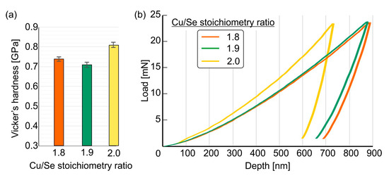 (a) Vickers microhardness and (b) nanoindentation for samples modified with varying copper contents with stoichiometric ratio Cu:Se = 1.8, 1.9, and 2.0 produced via cold pressing.