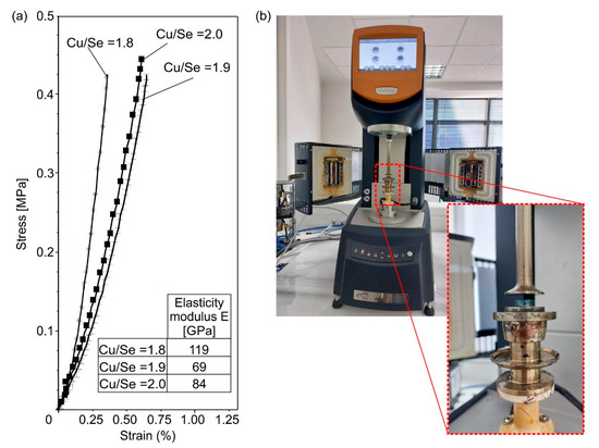 (a) Stress–strain curves for the samples with different Cu stoichiometries tested in elastic compression and elasticity modulus versus the Cu/Se stoichiometric ratio for the produced samples. (b) The apparatus used for the compressive testing.
