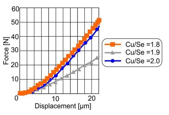 In the conducted research, a FEA-supported experimental methodology was developed for determining the flexural moduli of the investigated materials. In the first stage, three-point bending tests were carried out using the DMA machine. During this test, two supports hold the part, and a load is applied to induce flexure. The related results in terms of the achieved indenter displacement versus the applied force is shown in Figure 5. In these experiments, the applied force was varied until a consistent displacement of approximately 22 μm was achieved in all examined materials. Under the applied conditions, all samples underwent elastic deformation, as the residual deformation after load removal was virtually negligible. According to the results presented in Figure 5, the sample with Cu/Se = 1.8 demonstrates the greatest resistance to the applied load, requiring approximately 52 N to achieve a displacement of 22 μm. The sample with Cu/Se = 2.0, on the other hand, shows slightly lower strength under flexural loads. The sample with Cu/Se = 1.9 exhibits the poorest flexural behavior, requiring only about 25 N for the same displacement.