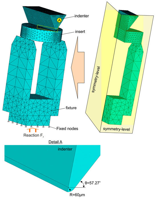 In the second stage, a 3D-FEM model was developed to simulate the three-point bending test, as illustrated in Figure 6. The simulation software was ANSYS 2024R1. The indenter geometry and the sample fixture accurately represent the actual setup. Isotropic elastic materials were applied for simulating the flexural behavior of the examined samples. The boundary conditions and the finite element discretization network are also depicted in the same figure. To minimize solution time, two levels of symmetry were utilized to describe the entire procedure. Convergence studies were conducted to determine the optimum mesh density and attain a mesh-independent grid. Due to insert geometry and the applied symmetry levels, a free meshing was used to mesh a model. To accurately simulate the three-point bending test, appropriate contact elements were incorporated to model the interfaces between the indenter and the samples, as well as between the samples and the holding fixture. The model parameters—including indenter and fixture geometries, sample thickness and length, and penetration depth—were designed to be variable, allowing for comprehensive analysis under different conditions. This finite element model enables the calculation of deformations, stress, and strain fields both during indenter penetration and after its removal. The developed reaction force Fz is equal to the indenter load; this force and the stress–strain fields depend on the indenter penetration depth. In this way, the load corresponding to a certain indenter penetration depth and moreover the von Mises stress–strain fields during sample loading and relaxation can be determined.