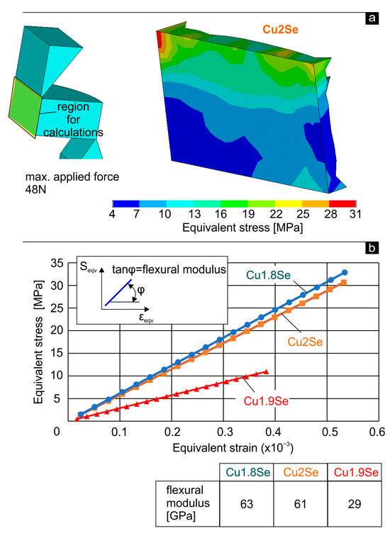 Characteristic result in the case of sample with Cu/Se = 2.0, obtained by the developed FEM model is exhibited in Figure 7a. The developed von Mises stresses correspond to the region as highlighted in the sketch within the same figure. This region is identified as the most endangered during the bending test. A load of 48 N was applied. This was necessary to achieve an indenter displacement of approximately 22 μm. Similar calculations were performed for further indenter penetration depths and corresponding indentation loads for all samples’ cases. Thus, it was possible to calculate the variation in the equivalent stress versus the equivalent strain for all samples’ cases, as shown in Figure 7b. Based on these results, the variation in equivalent stress versus equivalent strain was recorded for all samples, as illustrated in Figure 3b. The slope of the lines in Figure 7b, representing the tangent of the angles, determines the flexural moduli of the examined samples. These results are summarized in the table within Figure 7b. Among the investigated samples, the sample with Cu/Se = 1.8 exhibits the highest flexural modulus, whereas the sample with Cu/Se = 1.9 demonstrates the lowest.