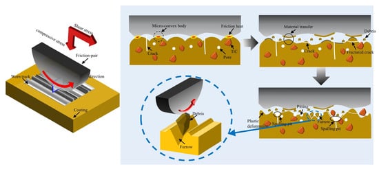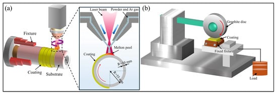Schematic diagram of Cu-TiC coating: (a) laser cladding; (b) friction–wear test.