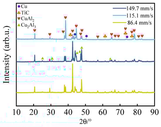 Figure 2 presents the XRD patterns of the coatings. The XRD spectra reveal that the coatings prepared at different scanning speeds were composed of Cu (PDF#04-004-8452), TiC (PDF#04-002-0155), CuAl2 (PDF#04-003-3349), and Cu2Al3 (PDF#04-001-0923) phases and the corresponding space groups of Fm-3m (225), Fm-3m (225), I4/mcm (140), and P-3m1 (164), respectively. The CuAl2 and Cu2Al3 phases are common intermetallic compounds in Cu-Al composite materials, indicating the coatings contained a high content of Al due to substrate dilution []. The low peak intensity of TiC in the XRD pattern is attributed to its low content in the coating. It is also observed that as the scanning speed increased from 86.4 to 149.7 mm/s, the intensity of the CuAl2 peak decreased, while that of the Cu2Al3 peak exhibited an increasing trend.