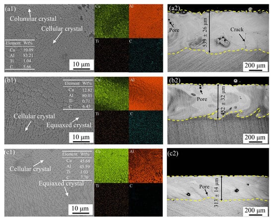 Morphologies and mapping analysis of Cu-TiC coating surfaces at different scanning speeds: (a1,a2) 86.4 mm/s; (b1,b2) 115.1 mm/s; (c1,c2) 149.7 mm/s.