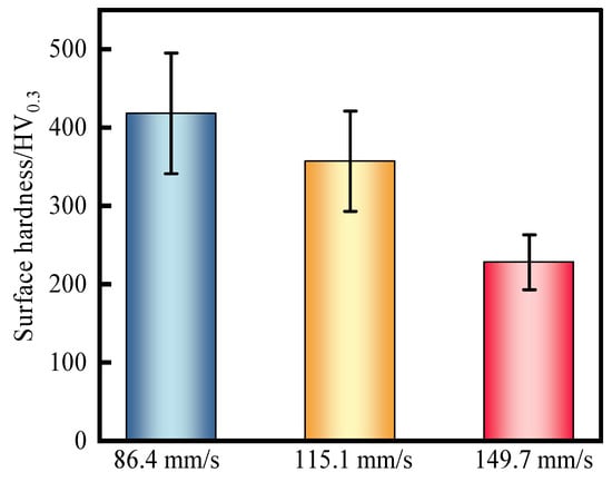 Figure 4 showcases the average hardness of the Cu-TiC coating surfaces at different scanning speeds. The average hardness values of coating surfaces at scanning speeds of 86.4, 115.1, and 149.7 mm/s were 401, 346, and 176 HV0.3, respectively. The results show that the hardness of the Cu-TiC coatings decreased with the increase in scanning speed, which is attributed to the content change in CuAl2 and Cu2Al3 (Figure 2). The observed hardness reduction originated from the interaction between phase transformation dynamics and microstructural evolution. The increased scanning speed induced non-equilibrium solidification conditions that thermodynamically suppressed the formation of the high-hardness and stable equilibrium phase CuAl2 while promoting the precipitation of the low-hardness phase Cu2Al3, thereby diminishing the overall hardness of the Cu-TiC coating system []. Although grain boundary refinement achieved by increasing the scanning speed could improve the hardness through the Hall–Petch mechanism, the microstructure optimization could not offset the significant decrease in hardness caused by the decrease in the content of the reinforcing phase CuAl2 within the coating.