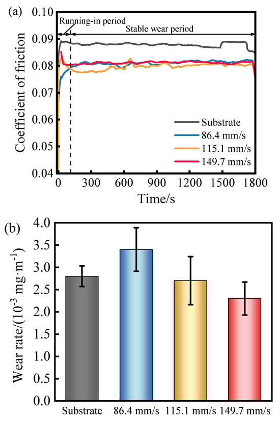 Figure 5a shows the COFs vs. sliding time of Cu-TiC coatings prepared at different scanning speeds. The friction between the coating and the friction pair was due to the contact between their respective micro-convex bodies []. The contact area of micro-convex bodies was small during the running-in period, thus resulting in the COF curves of the substrate and coating showing an upward trend []. The contact area of micro-convex bodies increased as the friction time continued, and the COF curves reached the stable wear period, where they fluctuated around a fixed value. The COFs of the coating at scanning speeds of 86.4, 115.1, and 149.7 mm/s were 0.088, 0.081, and 0.080, respectively.