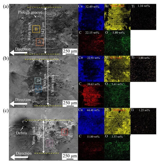 Figure 6 presents the morphologies and mapping analysis of worn tracks on Cu-TiC coatings at different scanning speeds. The content of Cu and Al on the worn track was lower than that of unworn coating, showing the coating loss from these elements. Conversely, the content of O and C on the worn track showed the opposite trend. The increase in O originated from the frictional heat caused by the adhesion, shear, and collision of micro-convex bodies between the worn track and friction pair []. The increase in C was due to the material transfer between the friction pair (graphite) and the coating under the action of shear stress. With the increase in scanning speed, the decrease in C content and the increase in Cu on the worn track indicated a reduction in material transfer, and the widths of the worn tracks also showed a decreasing trend.