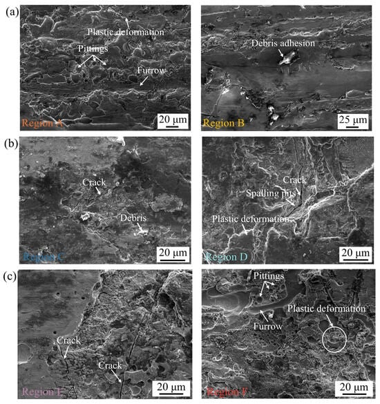 Figure 7a showcases the worn track morphologies of Cu-TiC coating fabricated at a scanning speed of 86.4 mm/s. During the friction process, the combination of shear and compressive stresses resulted in the plastic deformation features on the wear surface []. Meanwhile, frictional heating and compressive loading promoted adhesive interactions, inducing cold welding phenomena. When interfacial stresses surpassed the adhesive layer’s yield strength, material transfer and adhesion pits occurred. The part of wear debris generated in the friction process was adhered to the worn track by cold welding, while the rest of the debris was compacted into the worn track by the friction pair in the form of three-body abrasive wear. Under the action of shear stress, this wear debris plowed the coating surface, generating the characteristics of furrows. Therefore, the plastic deformation and the abrasive cutting caused the TiC on the worn track to peel off, which acted as hard abrasive particles, aggravating the wear loss []. Notably, the neighboring areas where cracks already existed during the coating manufacturing process were more prone to spalling under shear stress, leading to more material loss.