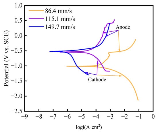 The potentiodynamic polarization curves of Cu-TiC coatings at different scanning speeds are presented in Figure 9, and the relevant fitting data from the Tafel extrapolation method is listed in Table 3 []. The polarization resistance (Rp) is calculated as follows: