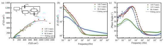 where ZQ is the CPE impedance; Y0 denotes the admittance of the CPE belonging to the constant; j represents the imaginary unit; ω exhibits the angular frequency (rad/s); and the parameter n quantifies the deviation of the CPE from ideal capacitance. Smaller n values suggest a more uneven, rough, and defective passive film. Qf and Qdl correspond to the passive film capacitance and the double-layer capacitance, respectively. Notably, at a scanning speed of 149.7 mm/s, the coating exhibited high-resistance Rf and Rct, effectively blocking the Cl− attack. Rct also signifies the electrode reaction’s kinetic rate, endowing the coating with exceptional corrosion resistance. At this speed, nf and ndl values were 0.88 and 0.91, respectively, and close to 1, indicating a relatively dense passive film on the coating surface.