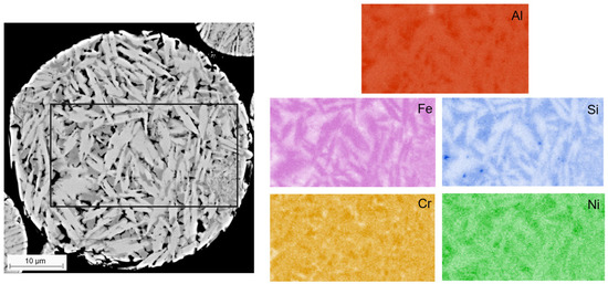 Cross-sectional SEM-EDS maps showing the spatial distribution of Al, Fe, Si, Cr, and Ni within AlFe18Si8Cr5Ni2 powder.