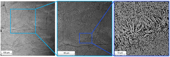 SEM-BSE micrographs of the PBFed AlFe18Si8Cr5Ni2 sample at three different magnifications.