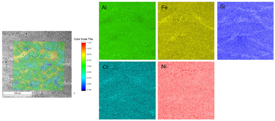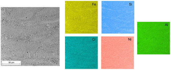 A representative BSE micrograph of the AlFe18Si8Cr5Ni2 SST cross-section and Al, Si, and Fe distribution maps obtained via EDS analysis.