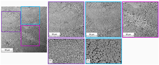 These more detailed analyses revealed that the finer microstructure initially observed in Figure 3 at the melt pool center is of a dual nature; one component consists of simpler acicular phases arranged in star-like, interconnected patterns (reported in purple in Figure 5), while the other comprises globular features (reported in blue in Figure 5). Within the globular region, BSE imaging highlighted sub-micrometer-scale inhomogeneities, with distinct brighter areas indicative of higher-atomic-weight elements. These brighter zones appear to trace linear paths along multiple globular features, suggesting subtle segregation or clustering of heavier elements along specific directions. This intricate distribution of phases and compositional variations within the melt pool center provides valuable insights into the complex interplay of solidification dynamics and element redistribution during the PBF-LB/M process.