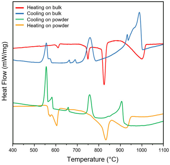 Starting with examining the heating curves of both the starting powder and the PBFed bulk sample, it is possible to observe several endothermic peaks. The endothermic nature of the peaks indicates phase dissolution or melting processes that require energy. The presence of these peaks in the DSC diagram confirms that the corresponding phases were present in the initial material, either in the powder after the rapid solidification during IGA or in the bulk material after the extremely fast solidification and remelting characteristic of the PBF-LB/M process. In the heating DSC pattern of the starting powder, the first notable feature is a double peak centered at approximately 580 and 600 °C. According to Han et al. [27] and Bhatt et al. [11], based on the Gulliver–Scheil model, the first peak can be attributed to the main eutectic reaction with the dissolution of the Al13Fe4 phase (often referred to in the literature as Al3Fe), which is consistent with the XRD findings (Figure 6). The second peak likely corresponds to the melting of α-Al, potentially overlapping with the fusion of the Al95Fe4Cr phase. Additionally, a pronounced third peak appears around 825 °C, followed by a broader, less intense peak near 920 °C. Based on Tang et al. [28], these peaks could be associated with the melting of primary Si or transformation related to Cr3Ni5Si2 phase, which was also detected in the XRD analysis.