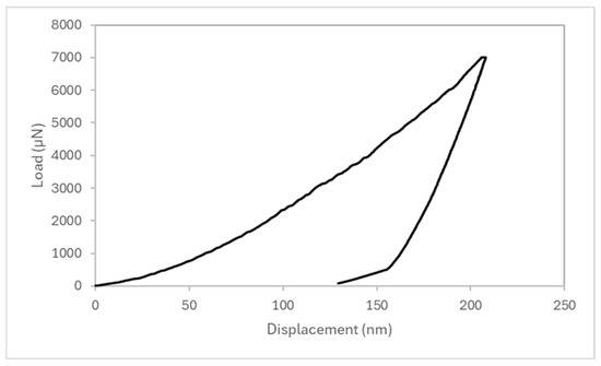 Although the measured Young’s modulus indicates a significant increase in stiffness, suggesting a potentially more rigid mechanical response with the normal Al-based alloy behavior, this prompted further investigation into the plastic deformability of the AlFe18Si8Cr5Ni2 alloy. It is well-known that the elastoplastic properties of materials are key indicators of their mechanical performance and have guiding significance in materials science and engineering. In recent years, the nanoindentation technique has emerged as a powerful tool to probe the intrinsic elastoplastic response of materials at the micro scale [31]. One preliminary indication of the alloy plastic behavior can be obtained by examining the residual displacement after the unloading phase of the nanoindentation test. Figure 9 shows a representative P–h curve for the AlFe18Si8Cr5Ni2 alloy, which reflects the average mechanical response observed across multiple indents.