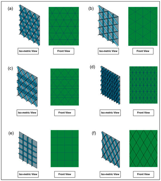 Aerospace grid panels: (a) isometric, (b) isometric II, (c) anisogrid, (d) bi-grid, (e) waffle, (f) X-grid.
