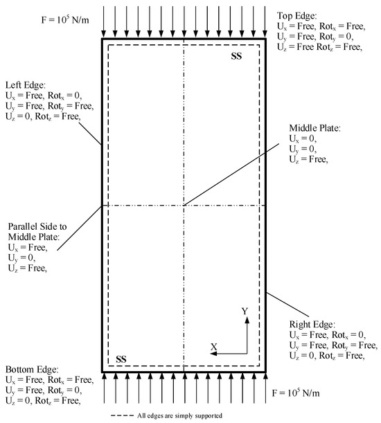 Quadrilateral elements are selected for the meshing of the panel. The connections between the panel and the stiffeners are evaluated to ensure proper bonding and to confirm that all components function together as a single unit during the simulation, as shown in Figure 2. The mesh size is set to 10 mm, validated against the same authors’ literature [41]. The boundary conditions are also consistent with the experimental setup of aircraft stiffened panels, where all edges are assumed to be supported for numerical solutions [41]. For the linear buckling analysis, a force of 1 kN is applied to both the upper and lower ends of the panel, along with the boundary conditions illustrated in Figure 3 [22].