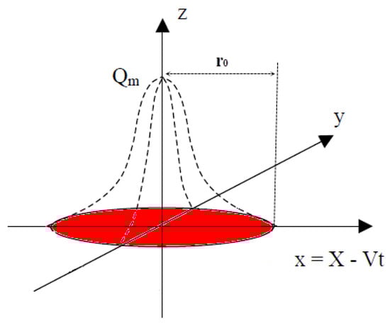 The surface Gaussian distributed heat source is represented in Figure 1. It had the shape of a bell; the following equations described it: