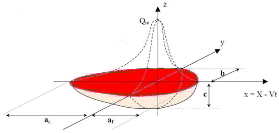 The Gaussian distribution is widely recognized and commonly employed in numerical modeling to represent the spatial power distribution of electric arc heat sources. Its smooth, bell-shaped profile effectively captures the way heat is concentrated and dissipated during welding processes, making it a standard choice in many simulation studies of arc welding. This approach facilitates accurate prediction of temperature fields and thermal effects in the material being welded. The shape of this source is a combination of two half-ellipses connected to each other with one semi-axis. Power distribution of this ‘double-ellipsoidal’ heat source is described as follows [].