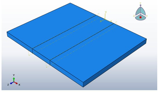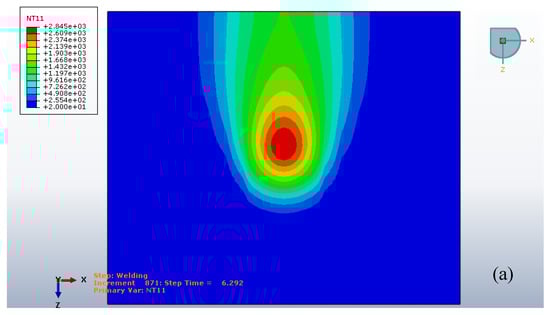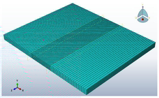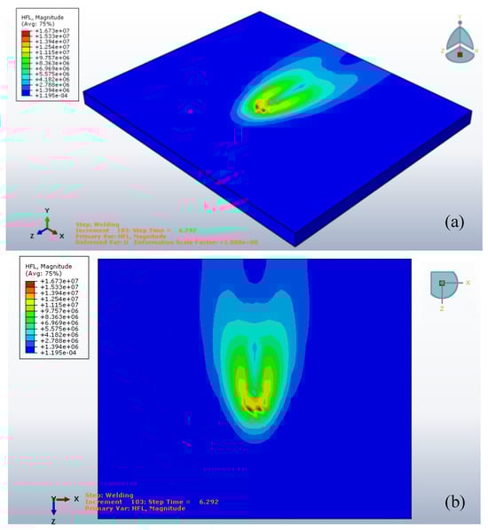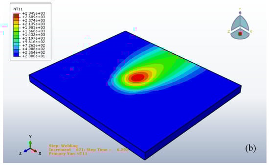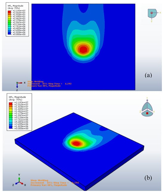 The ambient temperature (20 °C) was attributed to the unwelded exterior surfaces of plates as boundary conditions. The thermal load is applied to the weld joint using a surface heat flux based on a Gaussian distribution, while a volumetric heat source is employed in accordance with Goldak’s double-ellipsoidal model. In the mechanical finite element simulation to compute the stress and distortion distributions, boundary constraints are applied to the plate. It was fixed as a cantilever beam to observe the mechanical behavior during and after the welding process to prevent rigid body motion but allow the plate to deform [].