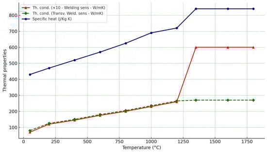 The temperature-dependent properties of the cast INC 738LC alloy, including specific heat capacity, thermal conductivity, and thermomechanical characteristics, were obtained from the literature sources [,,]. These properties are essential for accurately simulating the thermal and mechanical behavior of the alloy during welding. For clarity and better visualization, the variations of these properties as functions of temperature have been plotted and are presented in Figure 5 and Figure 6. These graphs illustrate how the material’s behavior evolves with increasing temperature, which is critical for the fidelity of the numerical model.